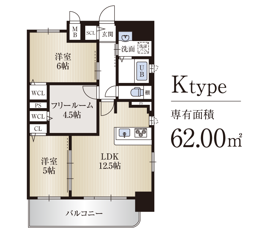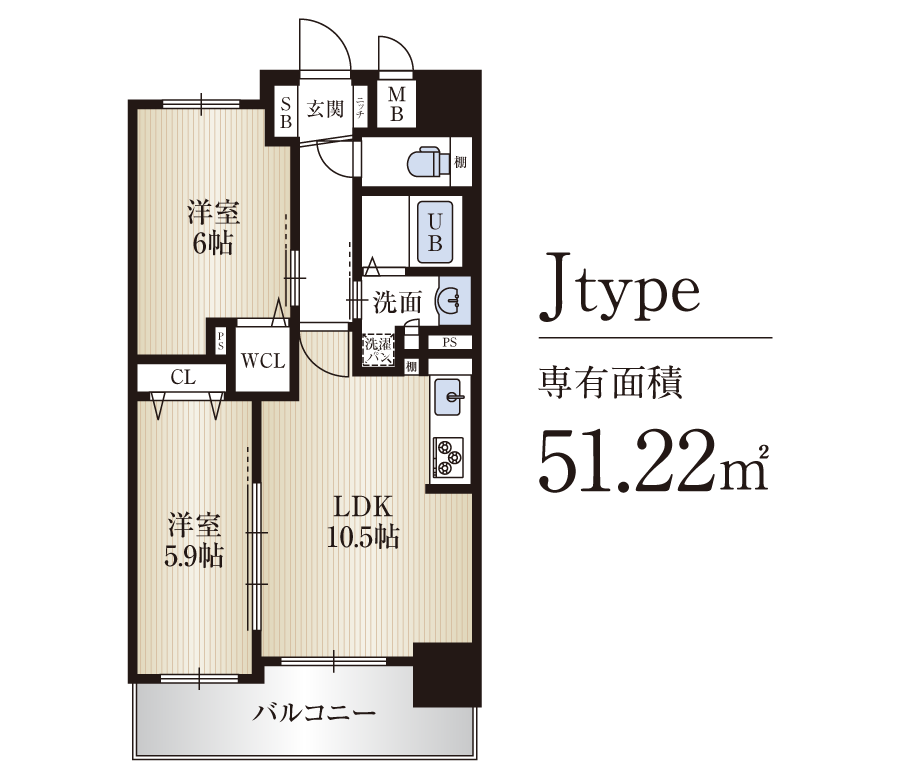 | 間取り | 1DK+バルコニー(C・DType) 1LDK+バルコニー(A・B・F・GType) 2LDK+バルコニー(I・JType) 2SLDK+バルコニー(Ktype) 3LDK+バルコニー(Htype) |