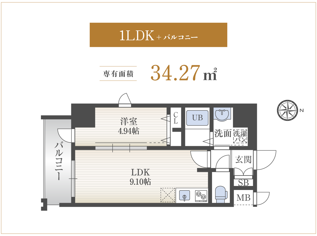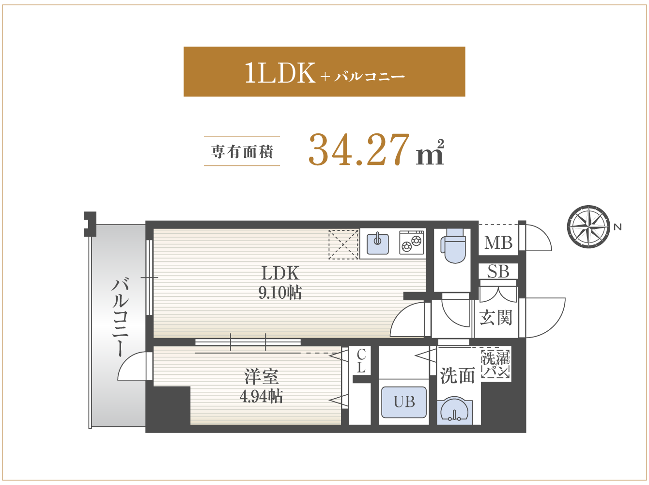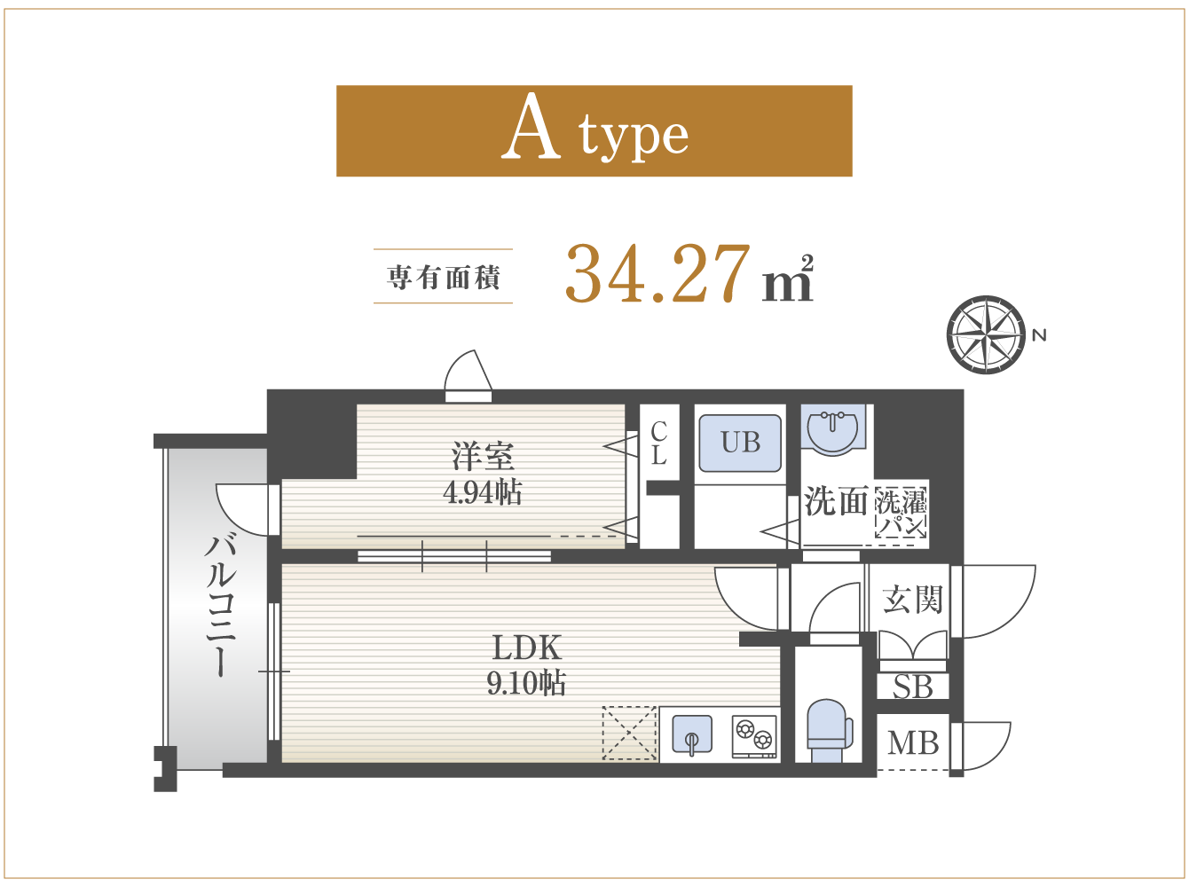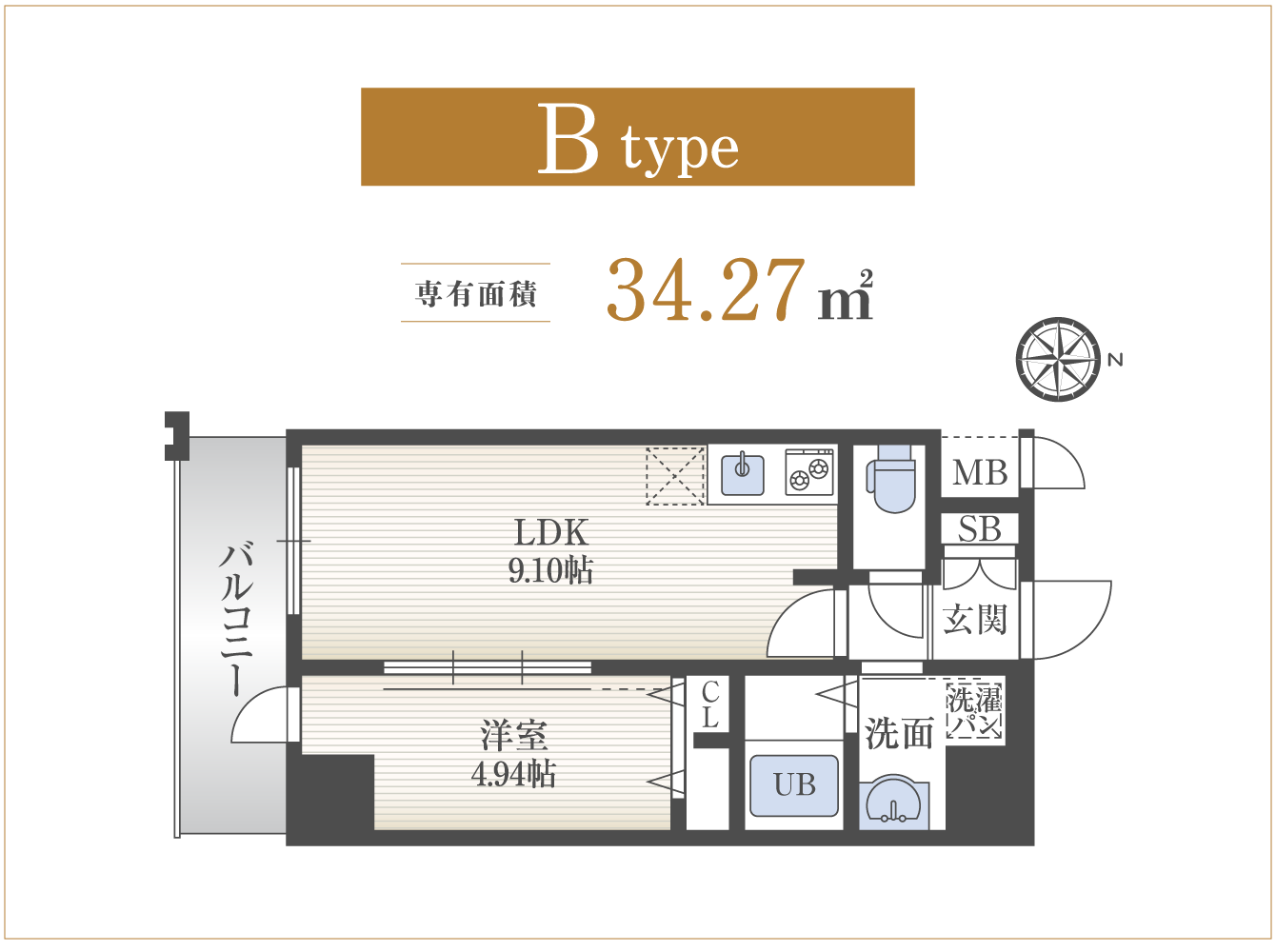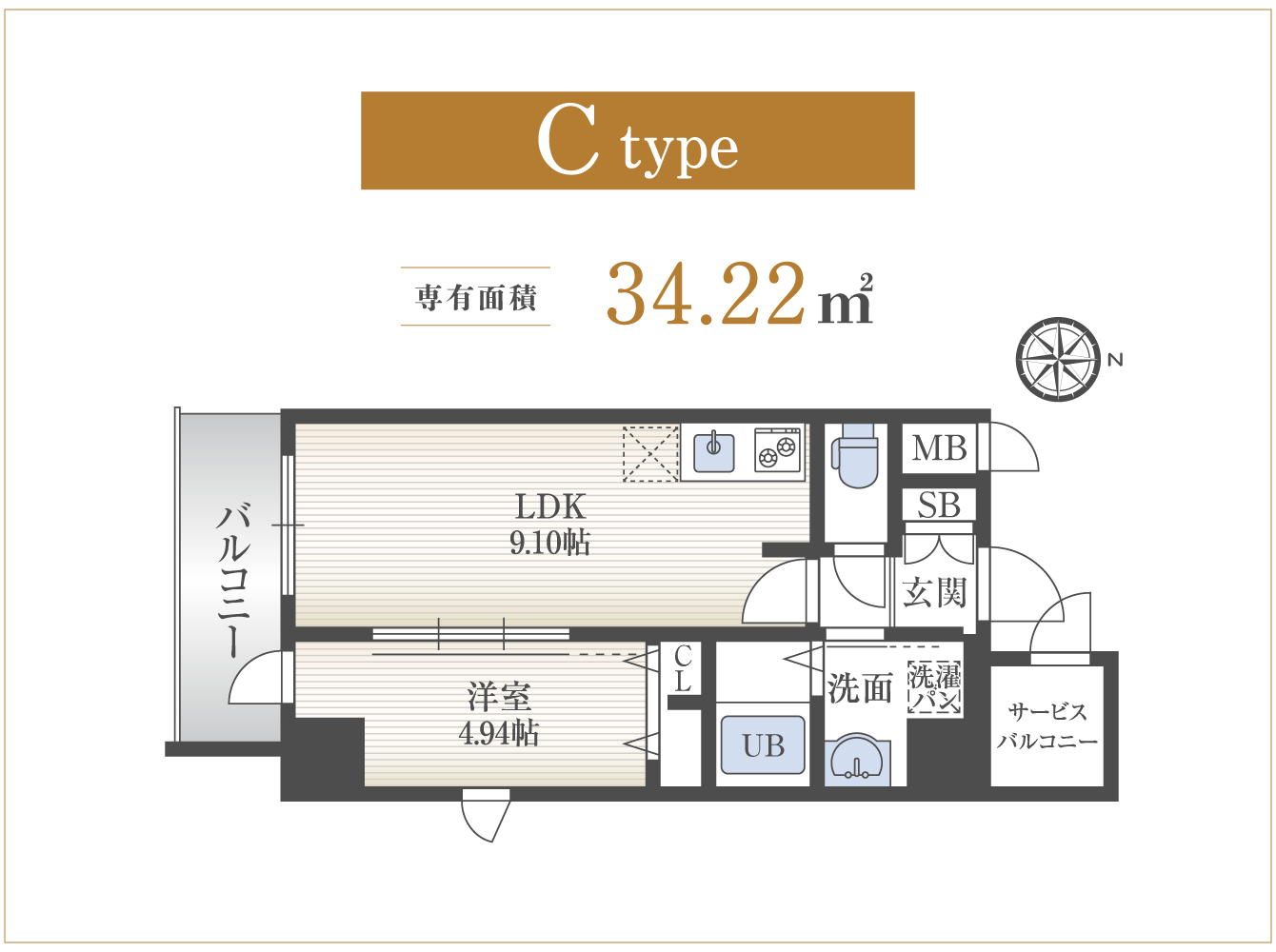 | 専有面積 | 【Aタイプ・Bタイプ】34.27㎡ 【Cタイプ】34.22㎡ |